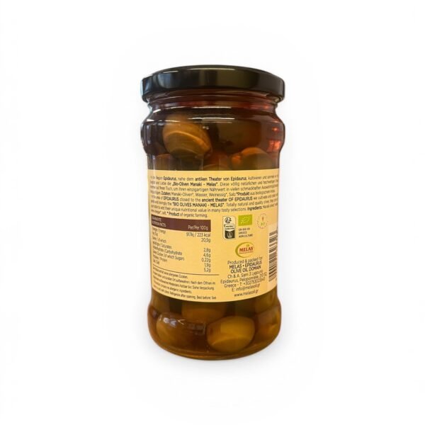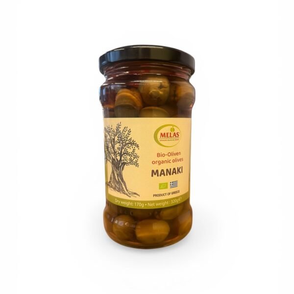 Nyt en ekte smak av Hellas med Manaki økologiske grønne oliven – friske, milde og naturlig balanserte.
