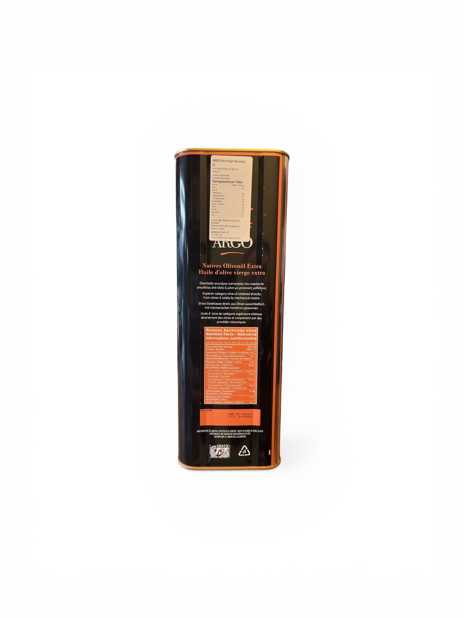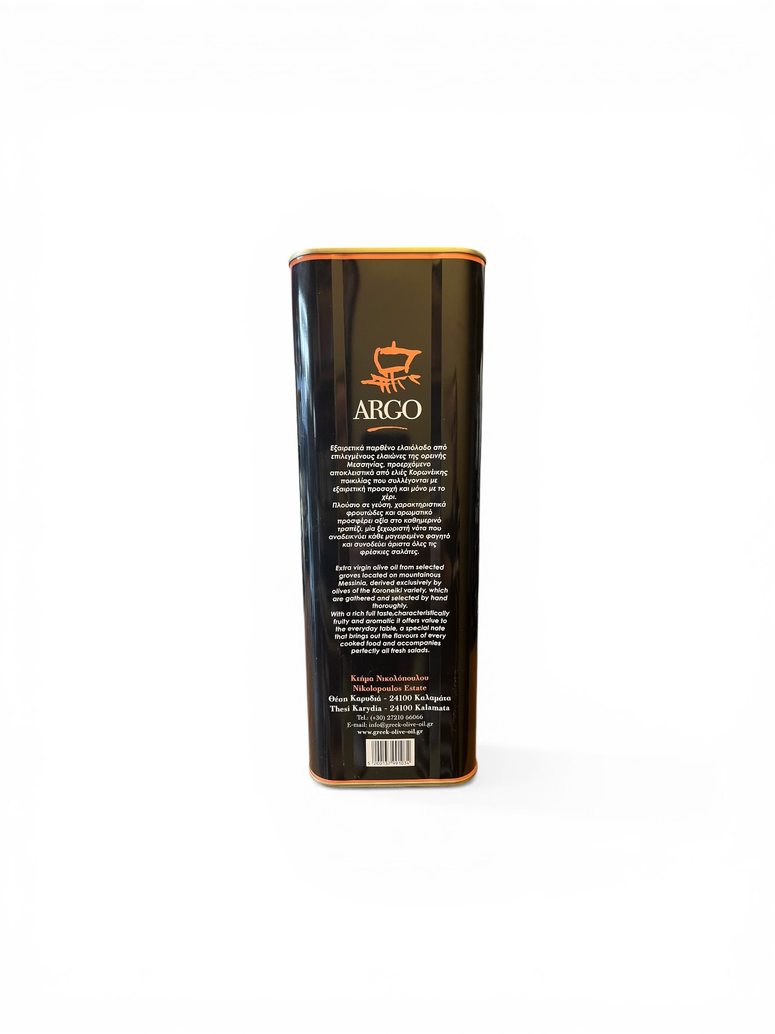 Opplev ekte gresk kvalitet med Argo extra virgin olivenolje i en elegant 5 liters kanne. Denne olivenoljen er laget av nøye utvalgte oliven og produsert med fokus på tradisjon, renhet og smak.