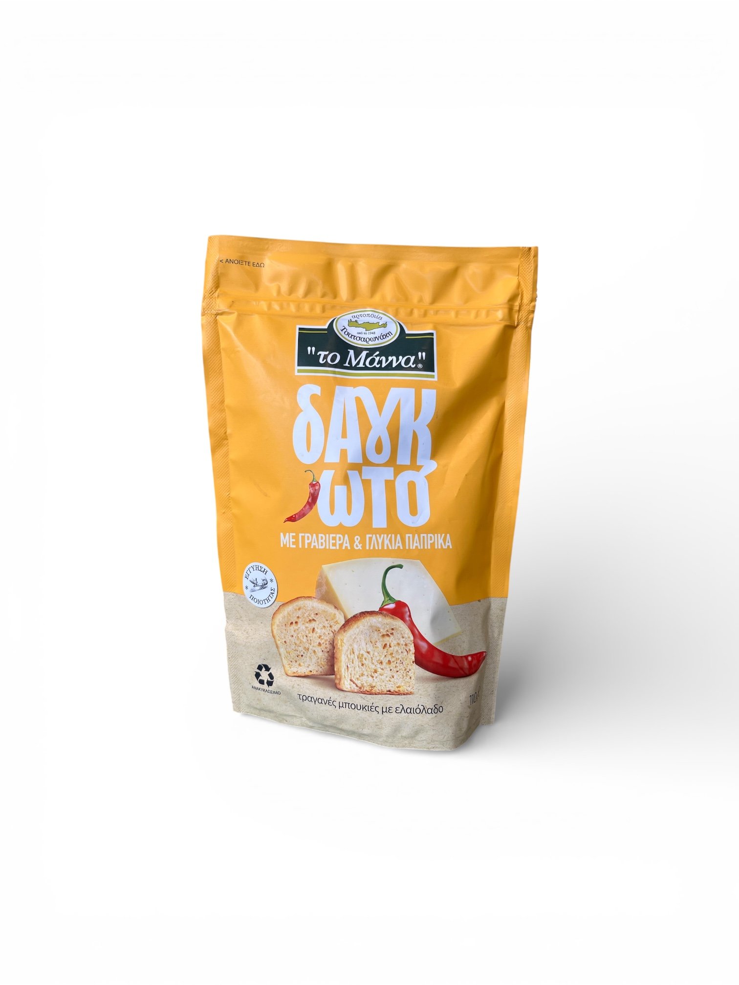 Den fyldige smaken av graviera, en klassisk gresk ost, kombineres med mild og aromatisk søt paprika, noe som gir en balansert og smakfull snacks med både rikhet og krydderpreg.