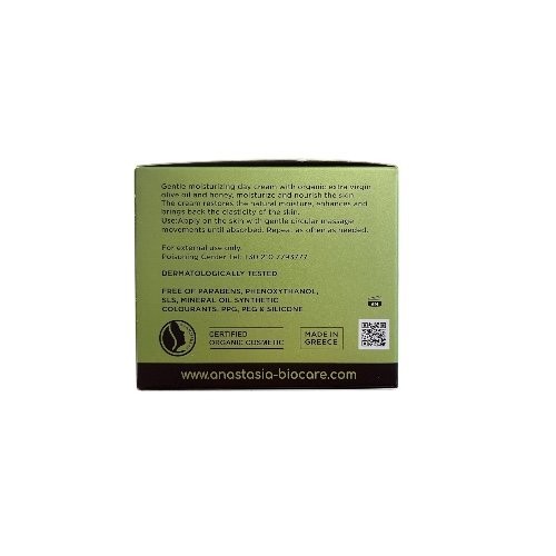 Denne økologiske dagkremen er formulert med næringsrik ekstra jomfru olivenolje og naturlig honning – to av naturens mest fuktighetsgivende og beskyttende ingredienser. Olivenoljen tilfører huden essensielle fettsyrer og antioksidanter, mens honning virker pleiende og bidrar til å bevare fukt gjennom hele dagen. Kremen absorberes raskt uten å føles fet og etterlater huden myk, balansert og smidig.