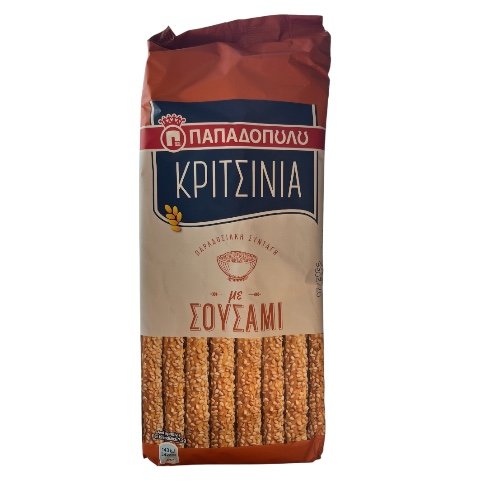 Sprø og smakfulle greske brødpinner (kritsinia) dekket med rikelig med ristede sesamfrø. Disse klassiske greske snackene er perfekte som tilbehør til ost, oliven, dip eller som et lett mellommåltid.